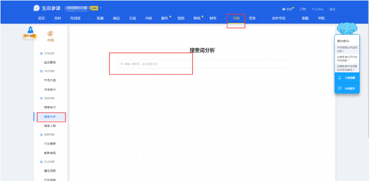 通过市场洞察来找词组合标题是我们经常会用到的一个方式,首先我们需要进入生意参谋后台,点击市场,然后点击搜索分析这个位置,通过这个位置,我们可以直接来搜索查找我们想要找的关键词,而且市场洞察的数据是最精准的,所以通过这个方式来找词也是最好,最完美的一种方式,一般找词我们就看最近7天的数据。