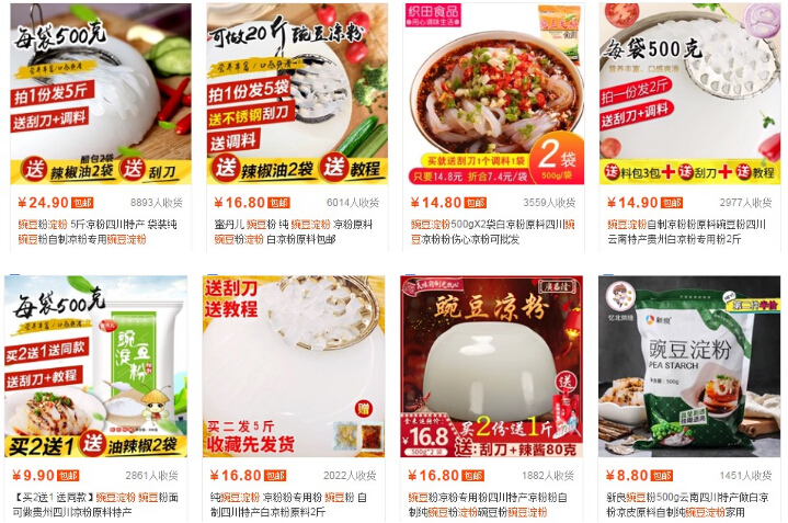 按销量排序,分析同行可以看出,市场上豌豆淀粉的价格大部分集中在15块钱左右两斤,卖的好的都有刮刀、教程赠送。
