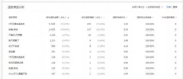 在退款原因分析里面,你可以看到该单品的退款原因是什么,每一个原因占比是多少,产生纠纷的笔数是多少等等。