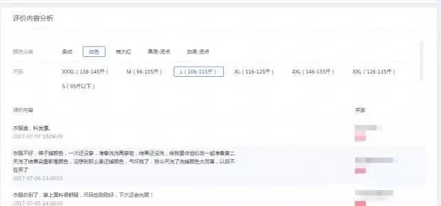 评价内容分析也是一个非常重要的指标,从这里你可以看到每一个颜色、每一个尺码的买家评语。