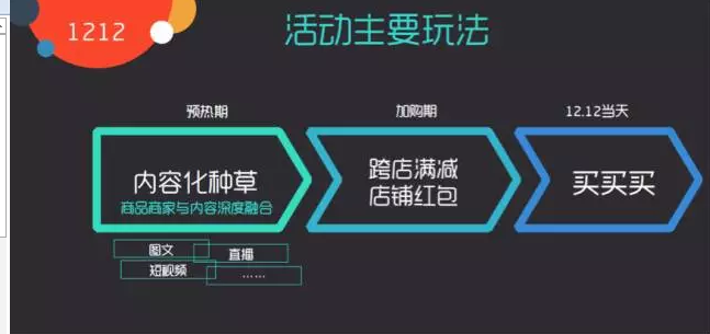 在预热期,针对特色内容,结合图文也好、短视频也好,主要是针对商品做一些定制的精品内容。到了加购期是满减和店铺红包,12日当天是全面成交转化的过程。